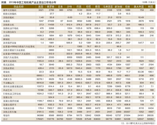据海关总署统计,2013年我国工程机械进出口贸易额为242.66亿美元,比上年下降3.12%。其中,进口金额47.35亿美元,比上年下降19.5%;出口金额195.3亿美元,比上年增长1.93%,贸易顺差147.97亿美元,同比扩大15.19亿美元。