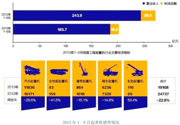 核心提示: 2013年我国流动式起重机市场需求持续低迷,全行业的生产和销售在2012年下滑的基础上继续下行。1-8月全行业营业收入186亿元,