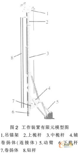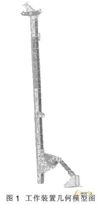 将UG建立的工作装置实体模型,导入NX MASTERFEM前处理器提取其中面,因为实体模型不重视几何体之间的连接性,因此需要对提取的中面进行缝补使其几何相联,同时在模型中保留需要用一维有限元单元来模拟的部分实体,如钻杆、绳索等,处理好的几何模型见图1。