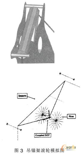 旋挖钻机工作装置的组成部件较多,结构复杂。为使计算准确,高效又能真实地反映出实际结构的特性,我们采用以下建模方法。对于厚宽比小于1/5的薄板采用shell单元来模拟,对于厚板采用计算精度较高的六面体solid单元划分,因为钻杆、油缸和绳索不是研究的重点,在这里我们进行适当简化模拟,钻杆和油缸采用Beam单元来模拟,绳索、销轴和螺栓采用Rbar单元来模拟,用耦合自由度(coupledDOF)来模拟工作装置相联的销轴处转动幅及钻杆支架的移动幅,根据实际结构各处的转动幅"释放耦合自由度的转动自由度.
