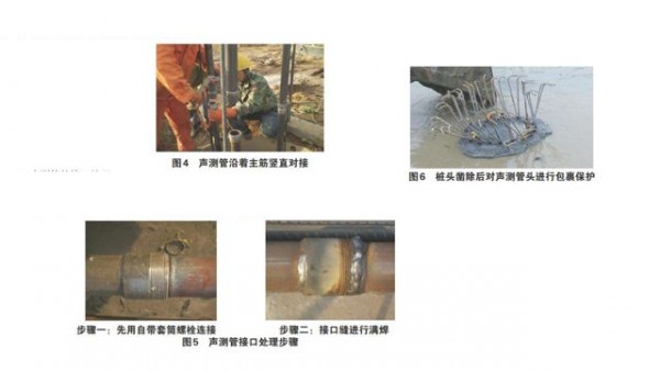 声测管在安装后都会套上橡胶皮套,并用铁丝紧固,防止异物和泥浆落入管内。但由于本工程承台个别桩基桩顶为高出地面,声测管也都是暴露在地面上。而现场施工过程如桩基移位、护筒打拔、勾机清理场地等等作业极易发生破坏声测管的现象。针对这种情况,现场施工人员应在每一个桩基施工完成后,在现场进行各种作业时,做好对声测管的保护,必要时要设立醒目的标志。桩头凿除时应向凿除作业的工人进行交底,让他们产生保护声测管的意识;当桩声测管露出时,应立即用布袋包裹管头并用铁丝扎紧,防止因橡胶皮套脱落而落入异物。以上的保护措施将极大的降低声测管被破坏而落入异物造成堵塞的情况发生概率。
