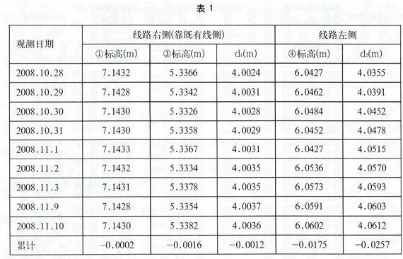 图2中①表示既有线路肩观测桩,②③④⑤均为路基外观测桩,②至③之间的距离为d,④至⑤之间的距离为d,(表1)