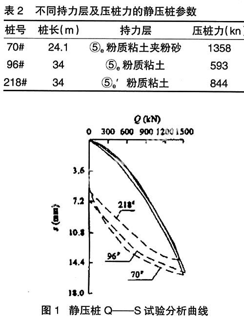 本工程打桩结束后,从现场选取3根不同持力层及压桩力(见表2)的工程桩进行抗压静载试验,最大检测荷载取二倍单桩承载力特征值,约1500kN。根据Q--S试验曲线分析,单桩的抗压极限承载力均达到1500kN,分析曲线见图1,同时,抽取13根不同压桩力的桩进行高应变动测,极限承载力均达到设计要求。