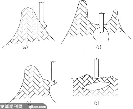 (c)、(d)石灰岩中广泛存在着突起及溶洞,施工时往往造成“假收锤”的现象。在进行载荷实验时,当桩体上传来的力压碎突起或溶洞上部的岩层时,桩体即告破坏,此时桩的承载力远远达不到设计要求。