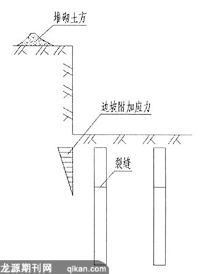 3、基坑开挖范围不合理。基坑边缘距离最外侧一排桩距离过紧。该工程开挖后的土石方亦近堆放在基坑附近,造成边坡附加应力超过桩体抗弯弯矩,导致桩体破裂。如图所示: