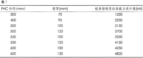 预应力管桩的承载力由桩身结构竖向承载力设计值和单桩承载力特征值决定。其中桩身结构竖向承载力设计值可以查国家建筑标准设计图集03SG409确定,其中常用的如表1所示: