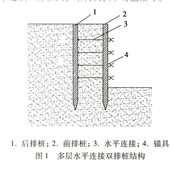 水平多层连接双排桩,在土层中设置两排平行桩,前后排桩多为预制桩、型钢桩以及加肋钢板桩,其中前排桩横截面大多为圆形或三角形,同一排桩与桩之间间隔为80mm左右,方便钢绞线通过。通过特殊方式,多层水平连接将前后两排桩连接起来。