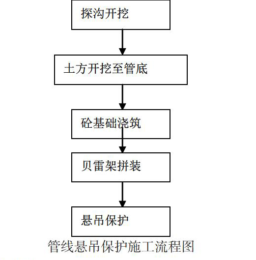 管线悬吊保护施工流程:探沟开挖→土方开挖至管底→混凝土基础浇筑→贝雷架拼装→悬吊保护。