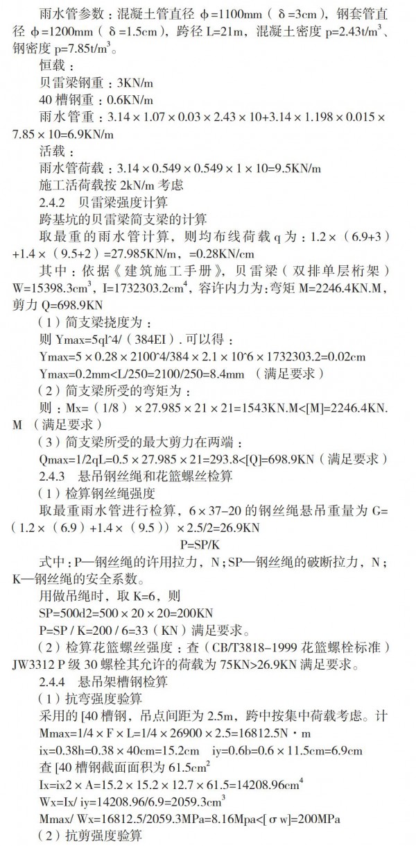 将管线周围的土方采用人工挖土方式将土方外运,然后施做贝雷梁,将贝雷架置放在已经完成的冠梁上,通过400#槽钢将贝雷架连接起来,通过U型卡将槽钢和贝雷架固定。二根燃气管、通信线、雨水管及污水管共用3组900型3m*1.5m贝雷梁悬吊,在与基坑边相交处施作悬吊梁支座基础,部分管线采用40型槽钢横担施工。燃气管、通信线用Ф14钢丝绳做吊带,雨水管及污水管用型号6×37-20的钢丝绳做吊带,钢套管接缝处焊接补强钢板防止管道接口断裂,共同组成悬吊体系。斜跨基坑的给水管采用3m×1.5m贝雷梁悬吊梁,在与基坑边相交处施作悬吊梁支座基础,管线用6×37-20钢丝绳做吊带,共同组成悬吊体系。