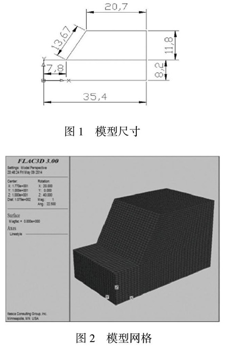 本文研究的数值模型是根据该课题模型试验中大模型尺寸定的。试验模型总长35.4m,宽20m,高20m,其中上部坡体高11.8m,基岩高8.2m。坡体前缘基岩长7.8m,坡度约为59.68°。模型尺寸如图1所示: