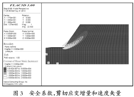 利用FLAC3D软件,根据最大不平衡力和坡顶中部节点Z的监测记录可知,坡体在重力作用下处于临界稳定状态,安全系数为1.03,与理正软件计算出的安全系数(1.043)基本一致。FLAC3D得出的安全系数、剪切应变增量和速度矢量云图如图3所示: