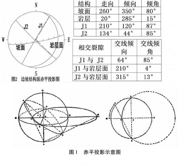 边坡走向260°,岩层产状285°∠15°,两者走向夹角为65°,为微倾坡内的斜向坡。仅边坡坡顶分布少量第四系覆盖层,坡体大部分为基岩,基岩内主要发育J0、J1、J2三组裂隙,为了分析边坡可能不稳定块体的稳定性,分析各组结构面及坡面的组合关系(见下表),作赤平投影图予以评价(见图2)。