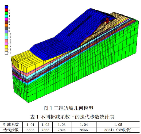 一般情况下所采用的强度折减计算方式都为整体折减方式,其应用原理是对所有材料强度均参照相同的折减系数进行统一计算,将计算所得的强度参数代入到公式中反复计算直至边坡失稳,以求得危险滑裂面。整体折减方式所采用的计算模型为三维边坡几何模型,如图1所示。该模型为六面体结构,假设岩质边坡条件为:四周边界法向约束,底部自下而上固定约束,模型最上部为自由区域。在对计算成果进行分析时,需将材料强度c、φ值同时除以折减系数F,反复多次,F值不断增大,且每次增量为0.01,直至计算不收敛。在不同折减系数的影响下,迭代步数也不同,迭代步数随折减系数的变化关系如表1所示。由统计表中可见,当折减系数由1.04变为1.05时,迭代步数激增突变,当折减系数为1.05时计算不收敛,从而将计算不收敛判据确定为边坡安全系数为1.05。