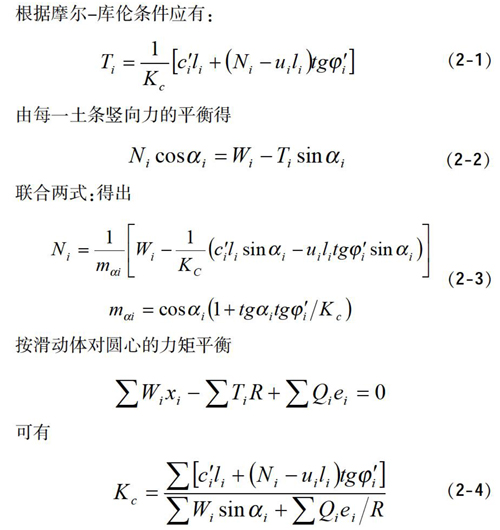 假定岩土体的破坏是由于滑体内滑面上发生滑动而造成的,滑动体被看成是刚体,不考虑其变形,滑面上岩土体处于极限平衡状态,并满足摩尔—库伦准则。滑面的形状可以为平面、圆弧面、对数螺旋面或其它不规则面,然后通过由滑裂面形成的隔离体的应力平衡方程,确定滑裂面上安全系数Fs的大小。其中安全系数Fs值最小的滑面就是最危险滑动面,其对应的安全系数值即为该边坡稳定的安全系数值。