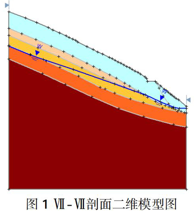 天然条件下Ⅶ-Ⅶ剖面边坡稳定计算结果见图2,计算结果表明安全系数为2.153。采用提供的岩土体物理力学参数计算得到的安全系数大于安全规范值,说明自然边坡比较稳定;而实际边坡同样是比较稳定的,故认为提供参数的物理力学参数是合理的,因此可以使用所提的物理学力学参数进行后续的稳定计算。