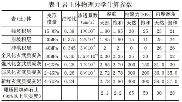 在静动力计算中,边坡岩(土)体均采用弹塑性模型,岩土体物理力学参数见表1。