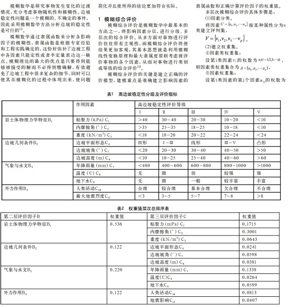 在边坡稳定性分析中,模糊综合评价能够综合考虑边坡稳定性的多个影响因素,全面把握影响边坡稳定性的一些不利因素以及它们之间的关系。通过隶属函数将各定性因素人为地将其量化,并且权重了各因素间的量化关系,使边坡的稳定性得以量化,得出边坡的安全等级。