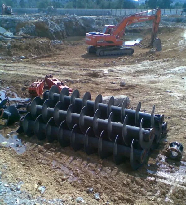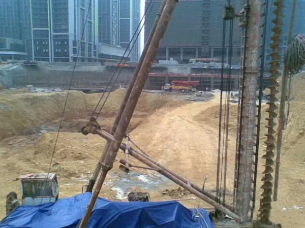 • 2、成孔:长螺旋钻机成孔,应匀速钻进,避免形成螺旋孔,成孔深度在钻杆上应有明确标记,成孔深度误差不超过O.1m,确保桩端进入持力层深度大于200mm:垂直度偏差小于1%。