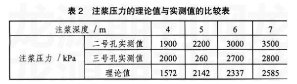 试验过程中1号和2号注浆孔在整个注浆过程中的注浆压力随深度的变化而变化,由此可见,注浆压力值大小与注浆深度有密切关系,根据试验现场的地质条件,根据现有注浆压力文献理论,由注浆扩孔过程中的能量守恒和体变平衡原理可以计算得出理论压浆值,[1~4]试验与理论对比如下表2。