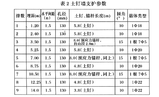 放坡高度=15.00m,放坡角度=90°,满布荷载值=10.00KN/m2,坡顶条形荷载值=360.00KN/m2,条形荷载左端点距坡面及坡顶交点的距离=9.00m,条形荷载宽度=40.00m,条形荷载深度=14.00m,土钉水平间距=1.500m。假定设计土钉、锚杆共计9排,基本参数见表2。