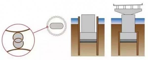 近期我们的日本代理商反馈,在爱知县高速路一座大桥的附近又修建了一座大桥,由于施工处地质比较差,此次围堰的施工采用了一种特殊的围堰方法-钢管桩围堰,管桩基础围堰直径为12米,它是由30根壁厚14毫米直径1米的钢管桩所组成,所有钢管桩的下沉都是由ICE振动锤55NF完成,55NF激振力171吨。这次围堰施工并不是采用钢管桩与拉森钢板桩相组合的形式,而是在钢管桩两侧各焊上一条C型槽,见下图1。这两条C型槽相扣非常紧凑,当围堰的所有钢管桩达到设计的深度后,可以把水和泥土等抽离出来后再筑承台及墩身,当桥墩完成后把超过承台上方的管桩部分割除掉。