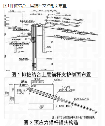 该工程综合基坑外部环境特点,以及自身受力合理、施工可行及围护造价低等多方面综合考虑,经过反复计算,多方案比选,设计采用Φ600~Φ800钻孔灌注桩作为挡土结构,并在周边卸除3m高土体;其内采用土层预应力锚杆、土钉、钢筋混凝土内支撑并在坑内和坑外均设置深井降水的多种围护措施相结合的方案。