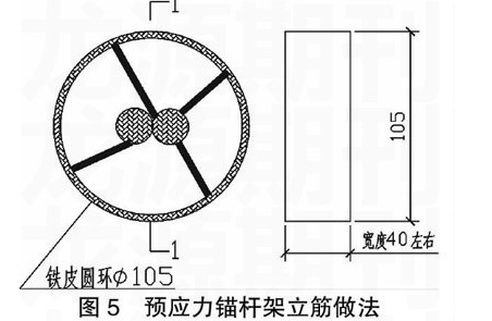 经施工现场采样观察,采用带水钻孔后成孔较好,未出现塌孔现象,如发现塌孔也可以再次复钻,可以保证成孔质量。为保证25m的预应力锚杆因自身自重较大,放在孔内后易出现钢筋触底,从而使底部锚杆包裹层达不到一定厚度,在锚杆制作时做好锚杆架立筋,如见图5所示;实际施工时采用铁皮焊接成圆环状,加短钢筋固定预应力锚杆,已保证水泥浆注浆过程中预应力锚杆的位置准确,保证锚杆体与孔内壁土体的接触面积。