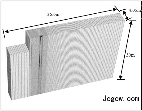 为减小计算量,截取矩形基坑中的一部分建立模型,模型的长度为4.05m,由于对称,仅取1/2建立模型,如图1所示。围护墙体厚度为0.6m,高度为13m,基坑坑内宽6m(1/2模型),模型其它尺寸见图1。靠桩基较近位置土体应力较为集中,网格划分较密,随距离增大网格尺寸逐渐增大。边界条件如下:地表各节点均自由,其余各面约束垂直于该面方向的位移。模型共444360个单元和471526个节点。采用修正的剑桥模型来模拟土体的非线性应力—应变特性,按不排水条件下的总应力分析,模型参数如下:土体重度γ=1.9kN/m3,泊松比μ=0.35,孔隙比e=0.62,超固结比OCR=1.0,压缩常数λ=0.09,回弹常数κ=0.0093,摩擦常量M=0.90,所取参数均与考虑了土的结构性的天津市第五土层参数相一致[9]。