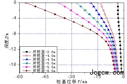 下面首先建立一个标准模型,标准模型中的各参数如下选取:围护墙体的弹性模量Ew=1.5GPa,桩基距离基坑开挖面X=3m,桩长Lp=18m,桩的弹性模量Ep=30GPa,桩顶为自由,然后再改变一些重要参数来研究对桩基的影响。标准问题中,当桩基位移为负值时表示其偏向基坑内部方向,反之则指向坑外方向;弯矩值为正值时表示远离基坑的桩的一侧处于弯曲受拉状态,反之则表示邻近基坑的桩的一侧处于弯曲受拉状态;桩侧土压力为正值表示桩侧土压力作用在桩基远离基坑的一侧,反之表示桩侧土压力作用在桩基邻近基坑的一侧。桩基位移为桩基轴心线的位移,单位长度上的桩侧力是通过累加单位桩长上接触面节点上的法向力和切向拖曳力在土体位移方向上的分量得到。