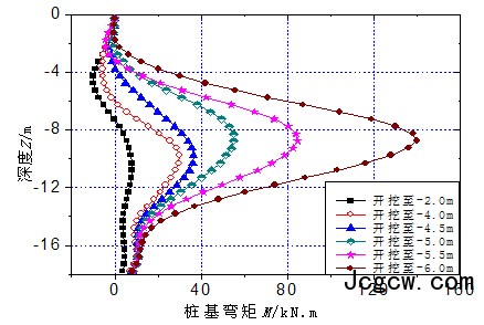 在计算模型中,悬臂围护墙体按C30混凝土设置,围护墙体厚度为600mm,弹性模量30GPa,相应的围护墙体抗弯刚度EI为540×106 N.m2/m。由于实际悬臂围护基坑的围护墙体抗弯刚度一般情况下要低于该值,因此在数值模型中通过仅改变围护墙体弹性模量的方法来改变围护墙体的抗弯刚度,在下面的标准问题中,围护墙体的弹性模量降低为1.5Gpa,此时围护墙体的抗弯刚度为27×106 N.m2/m,这大致相当于KSP -Ⅱ板桩墙的抗弯刚度。桩顶的约束条件可以简单分为桩顶自由、桩顶铰接、桩顶固定等几种情况,不同的桩顶约束条件对桩基弯矩、位移和桩侧土压力有较大的影响,参见文献[11],在本文中仅研究桩顶自由时的情况。