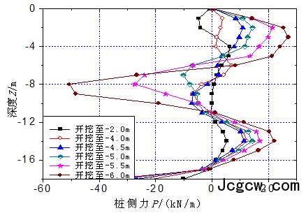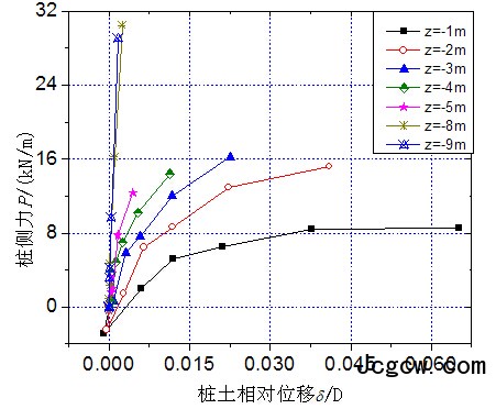 (1)在基坑最大开挖深度面以上,深度-1m~-5m,桩基的p-δ曲线基本呈抛物线型,随着埋深的增加p-δ曲线的初始刚度增大,仅在深度-1m范围内桩侧能达到极限土压力,在坑底以下p-δ曲线基本呈直线,其所达到的最大桩侧土压力要比在坑底以上要大的多。
