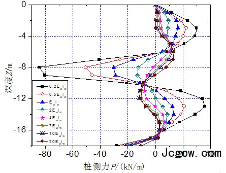 在实际工程中,悬臂围护基坑的围护墙体刚度可能相差较大,在数值模拟中可以通过仅改变围护墙体的弹性模量的方法来改变围护墙体弯曲刚度,围护墙体的弹性模量分别取0.3Gpa、0.75Gpa、1.5Gpa、3.0Gpa、6.0Gpa、15Gpa、30Gpa,相当于标准问题时围护墙体弯曲刚度EwIw的的0.2、0.5、1.0、2.0、4.0、10.0、20.0倍,其他与标准问题相同。不同围护墙体刚度时的桩侧土压力沿桩长分布见图4(基坑开挖到最大深度-6m时),随着围护墙体刚度的增加,桩侧压力减小。这主要是围护墙体刚度增加,坑后土体位移量减小,桩-土相对位移减小造成的。