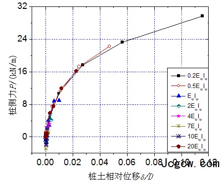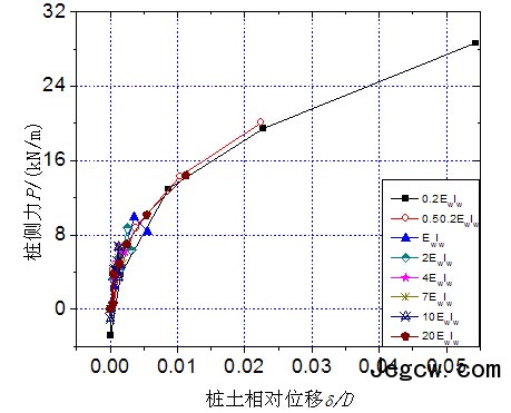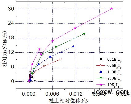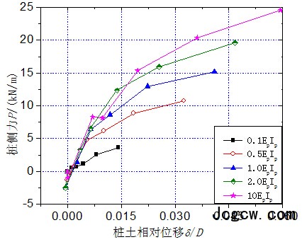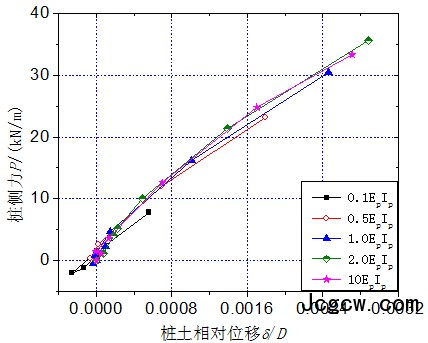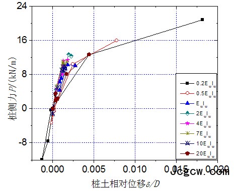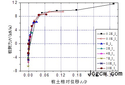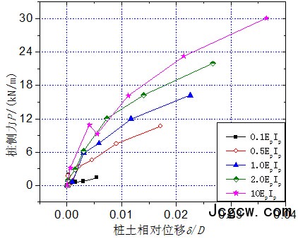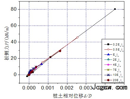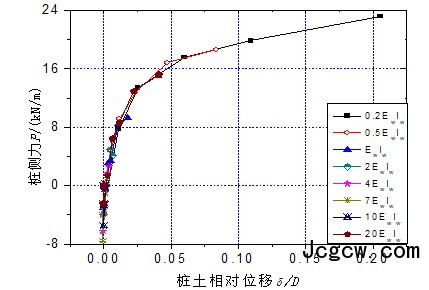 (2)不同围护墙体刚度时,桩基的p-δ曲线基本重合,当围护墙体刚度变小时,p-δ曲线长度增加,最大桩侧土压力和桩土相对位移都变大。