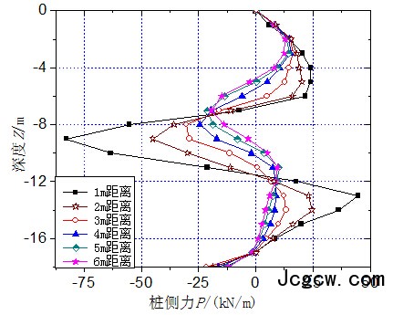 距离基坑开挖面不同距离时的桩侧土压力沿桩长分布见图6(基坑开挖深度至最大深度-6m时),桩基距离基坑开挖面的距离为1m~6m,随距离加大桩侧土压力逐渐减小。