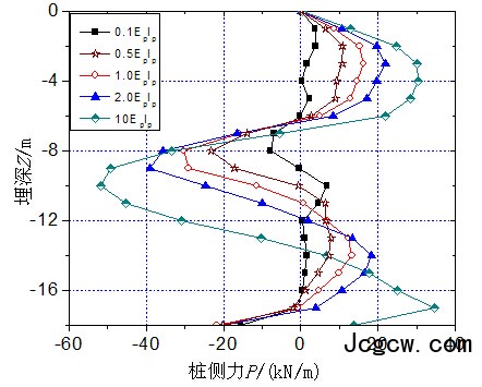 不同桩基刚度时的桩侧土压力沿桩长的分布见图8(基坑开挖至最大深度-6m),仅通过改变桩基的弹性模量来改变桩基的弯曲刚度,桩基的弹性模量分别为3GPa、15GPa、30GPa、60GPa、300GPa,对应的桩基弯曲刚度分别为标准问题时EpIp的0.1倍、0.5倍、1倍、2倍、10倍。随着桩基刚度增加,桩侧所受推力及抗力都有明显增大。