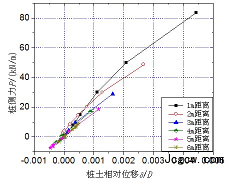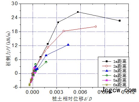 坑底以上各深度时p-δ曲线见图7(a)~(e),在浅层深度内-1m~-3m,当桩基离基坑增大时,在同一高程时所达到的桩侧土压力基本相等,各p-δ曲线基本重合,说明在这一深度范围内,受不同距离影响很小。在较深地层处-4m~-5m,在同高程处p-δ曲线初始刚度随距离基坑增大而减小,最大桩侧土压力和桩土相对位移δ都随距离增大而减小,说明在这一深度范围内,随距离增大,桩基受力减小。图7(f)是位于坑底以下深度为-9m时的p-δ曲线,可以看出随距离基坑增大p-δ曲线斜率稍有降低,长度变短,随距离增大桩基受力减小明显。