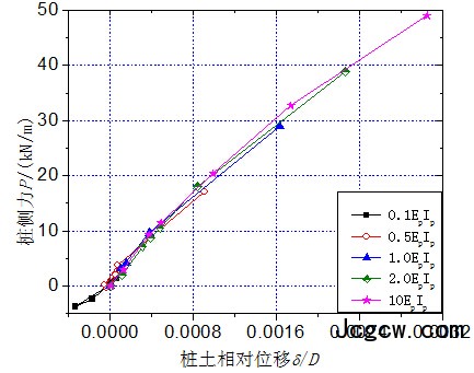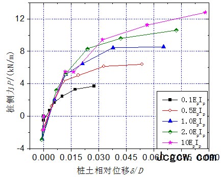 (4)随桩基刚度增大p-δ曲线初始段刚度增加,p-δ曲线长度增加,最大桩侧压力和桩土相对位移都增大。