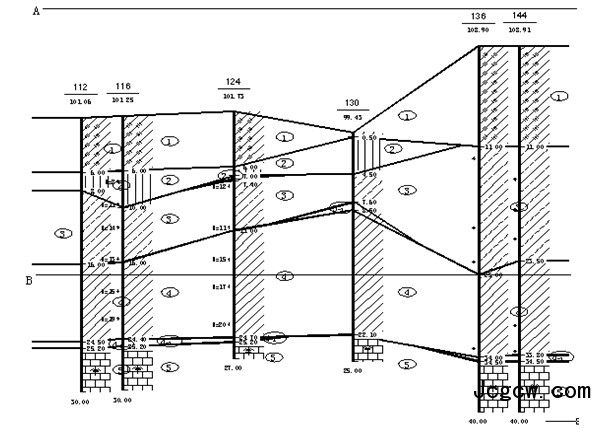 注:A为挡土墙基础底面标高4.60m(绝对标高111.35m);B为加固微型托换桩桩底标高31.60m(绝对标高84.35m)。