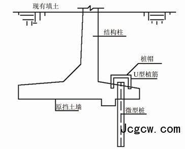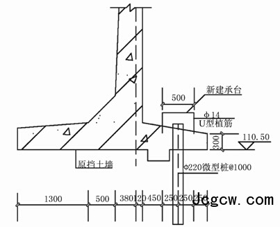 微型桩成孔采用水泥浆护壁成孔,成孔清孔后,孔底沉渣厚度不大于50mm,然后放入钢筋笼,插入注浆管至孔底部,用压力注水灰比0.5-0.6的水泥砂浆,直至灌满为止,注浆压力为0.2-0.5MPa。注浆管采用φ25的钢管,加工成花管形状(上部4m部分不加工),花管按500mm的行距,圆周3孔均匀布置,注浆管底端封闭,圆周小孔采用橡皮套单向封闭。新旧承台通过植筋连接,植入原承台深度250mm,内灌喜利得胶。