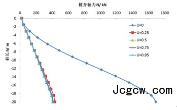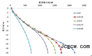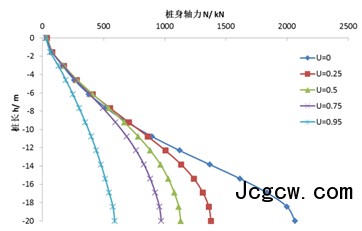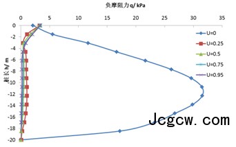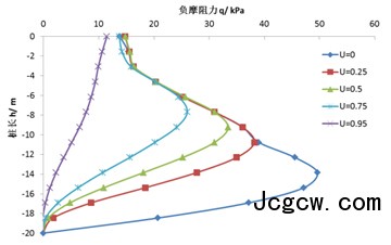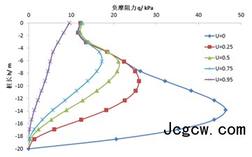 (1)初始固结度U=0时的桩身轴力和负摩阻力远远大于其它初始固结度的桩身轴力与负摩阻力。当初始固结度为0.5时,桩身最大轴力约为U=0时的70%,最大负摩阻力约为U=0时的67%;当初始固结度为0.95时,桩身最大轴力约为U=0时的32%,最大负摩阻力约为U=0时的23%。