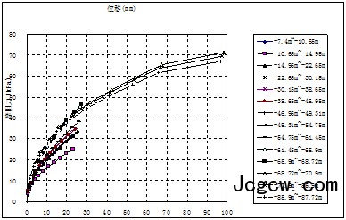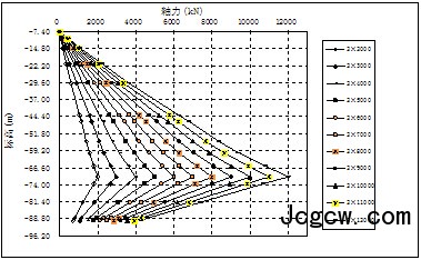 值便可由相应的相关方程求得。随着标高变化2Z-7#和2Z-6#检测桩的轴力变化曲线如图4和5。从图中可知,桩身轴力随着深度的增加趋势几乎相同,随着分级加载,轴力逐渐发挥出来。在标高-75m左右均出现明显的拐点,出现拐点之前,轴力随着深度增加而增加,拐点之后,轴力随着深度增加而减小。