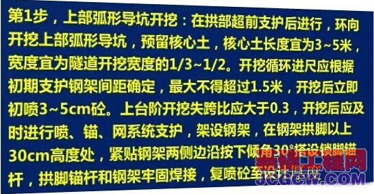 核心提示: 隧道三台阶七步开挖法(以下简称三台阶七步开挖法)是以弧形导坑开挖留核心土为基本模式,分上、中、下三个台阶七个开挖面,各