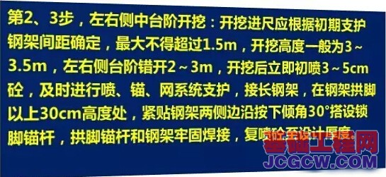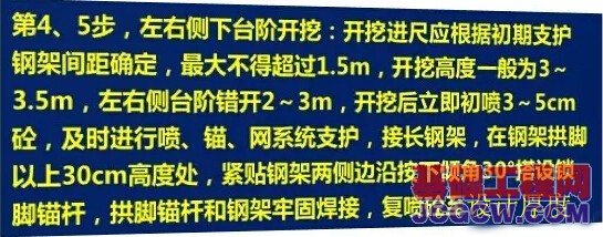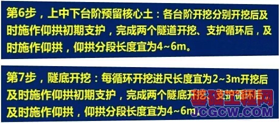 (1)采用三台阶七步开挖法施工的隧道,应将超前地质预报纳入施工工序,并根据工程水文地质变化情况,及时调整各部台阶长度或施工方法,采取相应的技术措施,及早封闭成环,保证施工安全。