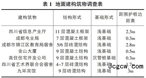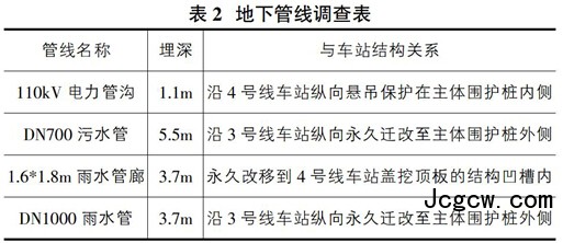车站周围建筑物较多,管线密集。车站施工期间特别需要保护的建构筑物和管线清理如表1、2所示。