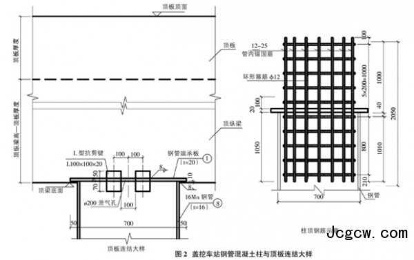 同时钢管混凝土柱兼作永久立柱,钢管柱本身与永久结构的中板、底板的节点连接也是盖挖法车站的关键问题。设计按照环板法连结钢管混凝土柱与现浇混凝土梁板,充分考虑受力和抗震要求,根据不同情况绘制了连结大样。