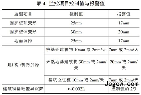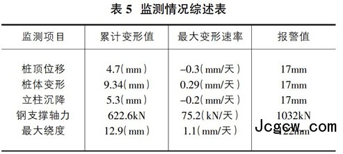监测数据反映整个基坑开挖和回筑阶段的支撑轴力、围护桩顶变形、围护桩体变形、中间立柱桩变形均控制在报警值以内。监测结果如表5所示。