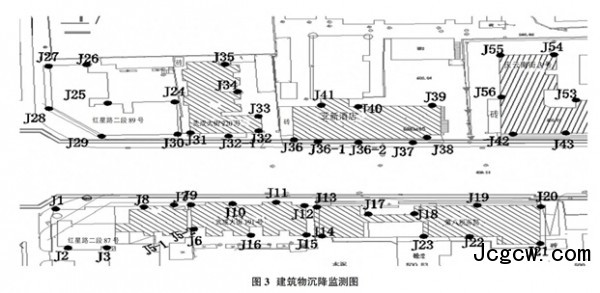 车站主体结构基坑周边房屋多为浅基础砖混结构,房屋基础持力层为稍密卵石层。为保证房屋安全,基坑开挖回筑过程中均对周边房屋进行了严密监测。具体布置如图3所示。