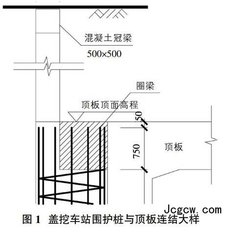 盖挖节点的设计需要每个工况功能要求,而每个阶段顶板与支座的连接形式对计算结果都影响很大。围护桩与顶板可采用铰接接头、刚性接头和不完全刚性接头三种形式。考虑到让围护桩参与抗浮并利用围护桩帮助顶板受力,本站设计将围护桩钢筋伸入顶板,桩顶设圈梁如图1所示。计算按不完全刚性接头考虑。