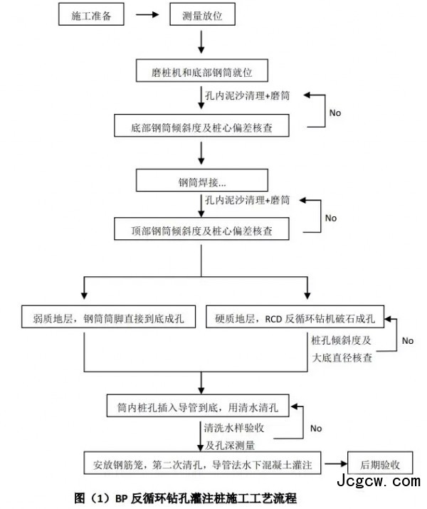 BP施工的大致步骤是首先利用钢筒入泥开孔,然后使用RCD 钻机反循环钻进破石,桩孔完成之后的主要工作是落入预制的钢筋笼和导管法进行水下混凝土灌注。RCD 反循环钻机的工作原理是,利用风机产生的巨大风压( 标准风流量可达19.1 m³/min - 45.3 m³/min ) 沿钻杆两侧的风管冲向孔底,孔底的冲洗液在风力的“鼓动”下携带钻渣沿钻杆内腔向上流出桩孔进入沉淀池,经沉淀过滤之后的水体冲洗液再流向桩孔,形成反循环。香港BP施工工艺流程如图(1)。