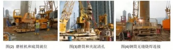 2.机械成孔:(A)在专业的磨桩机操作员的操作下,底部钢筒在液压式磨桩机的来回“搓动”下逐渐深入泥层,与此同时,钢筒中的软泥沙由泥夹进行逐步清除,如图(3)。(B)在底筒筒口到达距地面约3.0m的高度时,停止夹泥和磨筒。此时,应该请测量工程师使用专业仪器检核底筒的倾斜度和桩心偏差是否在规定的范围之内,如不满足要求,应立即回填桩孔并从新埋位开孔,直到检核 满足要求为止。(C)在完成上述工作之后,第二条钢筒将会由专业的烧焊人员通过烧焊的方法与底筒筒口无缝连接,如图(4)。(D)重复磨筒, 夹泥清孔和无缝烧焊接筒工作,直到钢筒筒脚到达要求的基底位置。最后,请测量工程师再次检核顶部钢筒的倾斜度和桩心偏差。